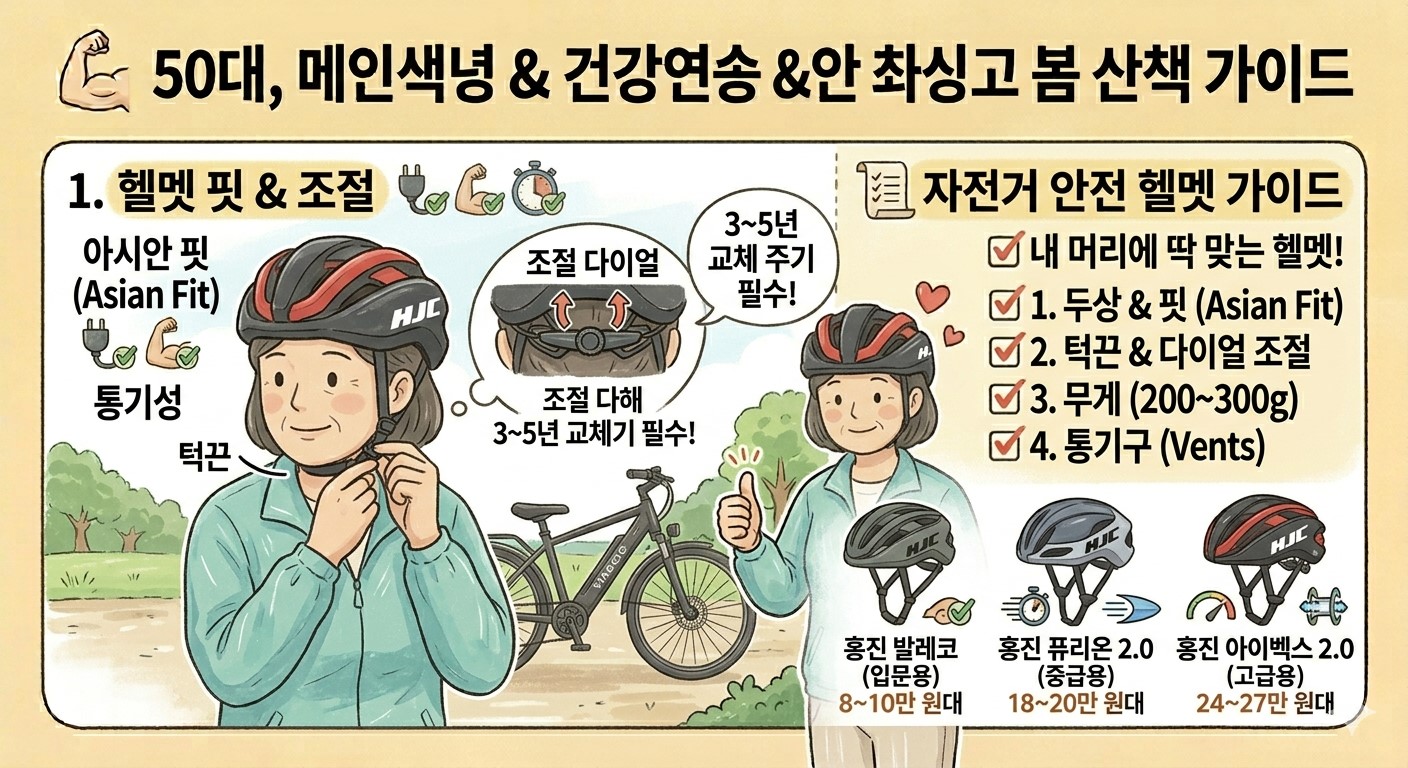 특히 50대 이후엔 순발력이 예전 같지 않아 예기치 못한 상황에서 대처가 늦을 수 있습니다. 오늘은 내 소중한 머리를 보호해 줄 자전거 헬멧 고르는 법과 세계적인 기술력을 자랑하는 국산 브랜드 '홍진(HJC)'의 라인업을 꼼꼼히 비교해 드립니다. 👇