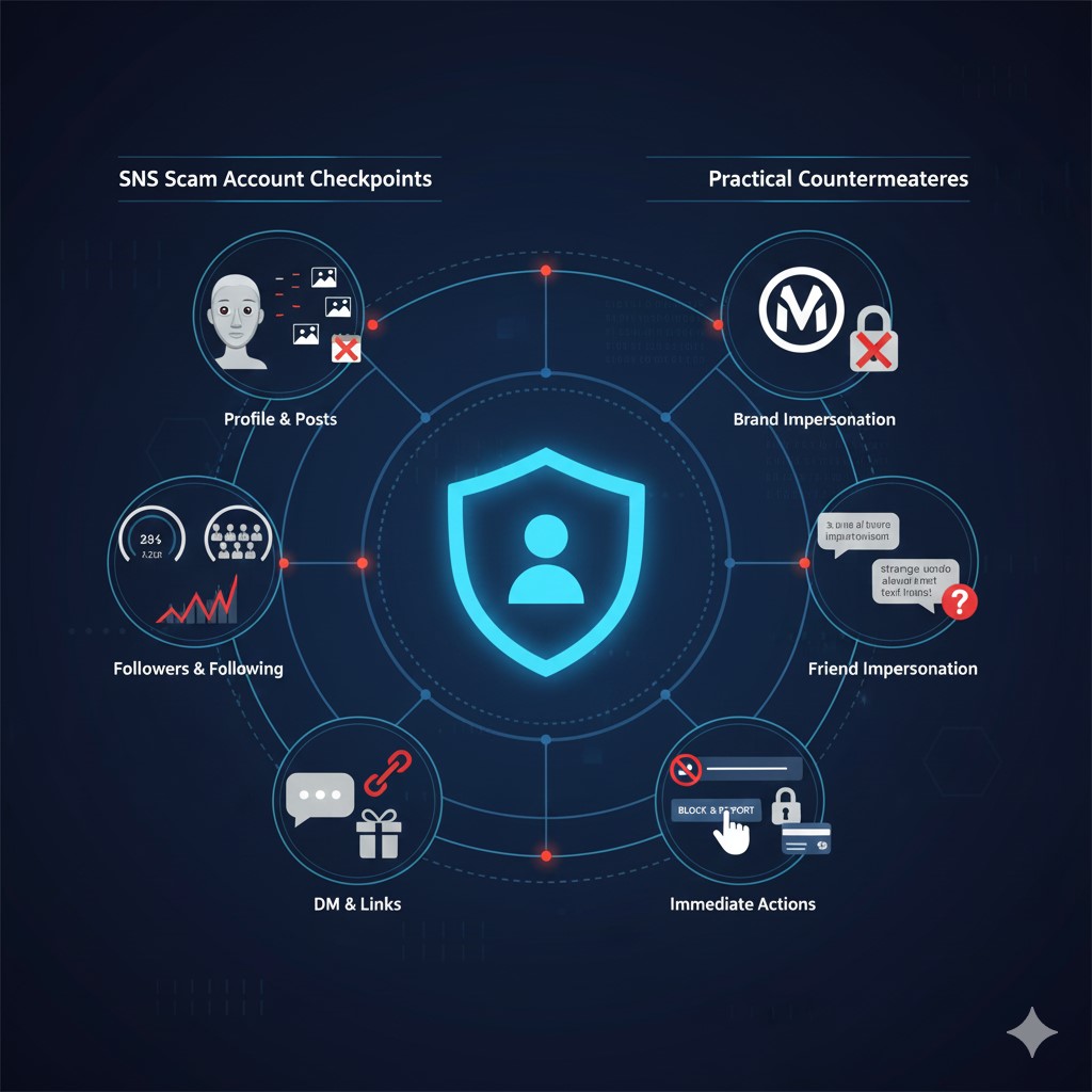SNS 사기 수법은 나날이 교묘해지지만, 프로필, 게시물, 팔로워, DM, 링크, 그리고 말투만 꼼꼼히 살펴보면 대부분의 사기 계정을 예방할 수 있습니다.