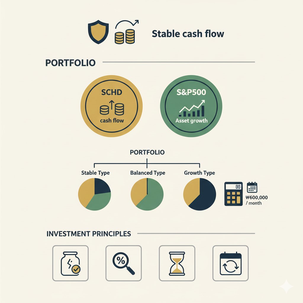 | 구분 | SCHD 비중 | S&P500 ETF 비중 | 현금성 자산 비중 | 목표 및 추천 대상 |