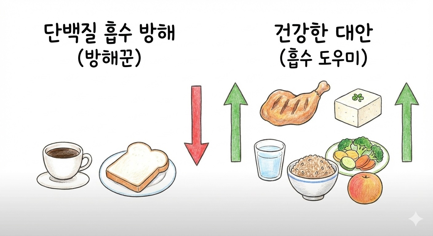 - 📌 대안: 단백질 식사 전후 최소 1시간의 간격을 두고 섭취하세요. 식후에는 미지근한 물이나 보리차가 가장 좋습니다.