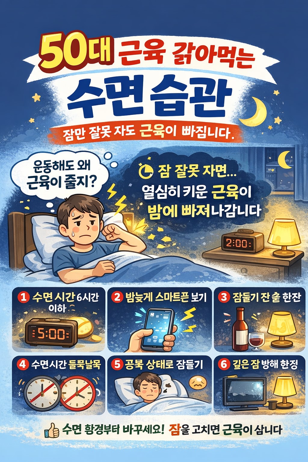 그런데 50대가 흔히 하는 몇 가지 수면 습관은, 열심히 키운 근육을 밤새 갉아먹는 역할을 합니다.
